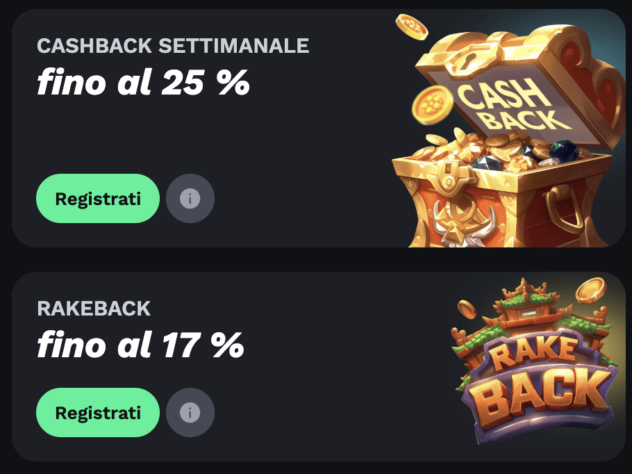 I giocatori abituali del casinò dispongono di Cashback fino al 25%. La percentuale viene calcolata in base al volume depositato e quello giocato nella settimana precedente.